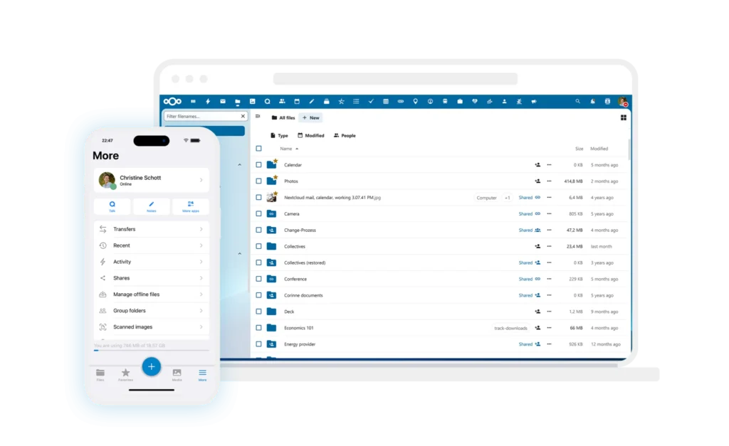 Os clientes Nextcloud Files para Android, iOS e sistemas desktop fornecem uma interface nativa para softwares de armazenamento em nuvem e compartilhamento de arquivos Nextcloud. Os clientes permitem que os usuários sincronizem e compartilhem arquivos, de forma totalmente segura por meio de uma conexão criptografada. Os clientes móveis apresentam upload automático de fotos e vídeos que os usuários tiram e podem sincronizar arquivos e pastas selecionados. Os clientes podem gerenciar múltiplas contas, mostrar toda a atividade no servidor e notificar os usuários sobre novos eventos, como a disponibilidade de novos compartilhamentos.